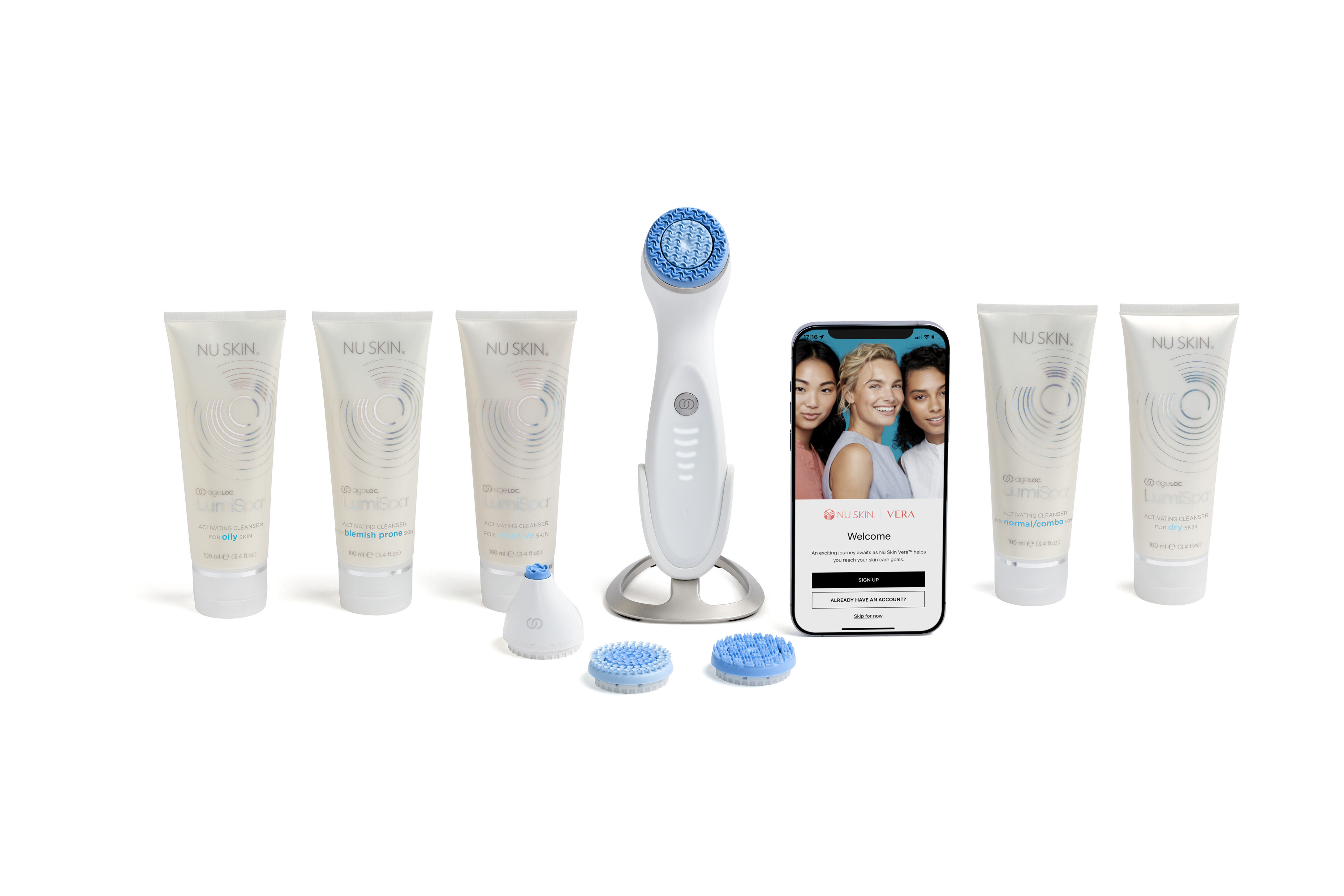 The ageLOC LumiSpa iO system includes the LumiSpa iO device, three non-abrasive treatment head options and five cleanser options that are scientifically formulated to enable precise cushioning, cleansing and interaction with the skin. In conjunction with the Nu Skin Vera™ app, the ageLOC LumiSpa iO unlocks a new world of personalized skincare experiences.